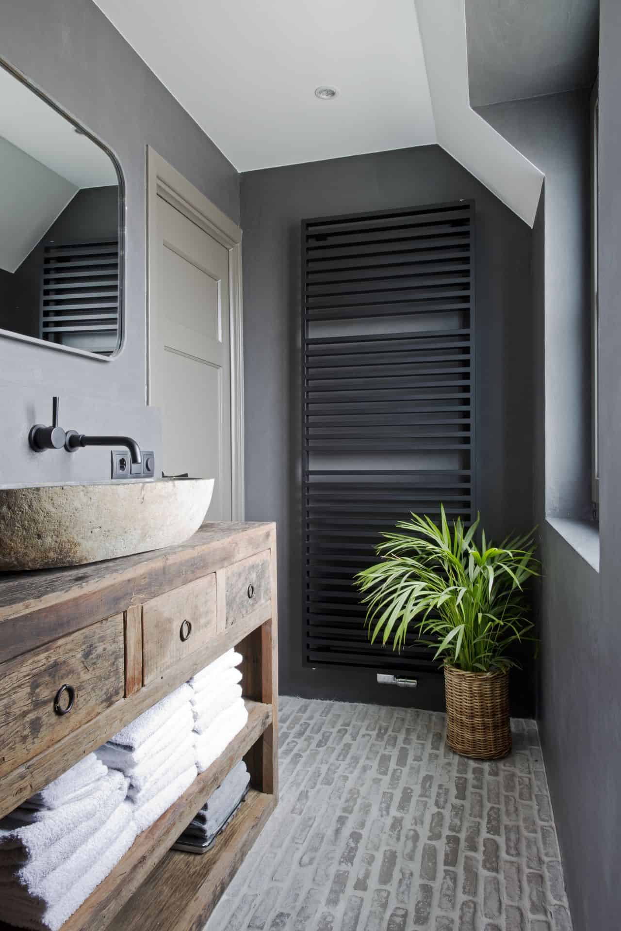 Een drukke vloer in de badkamer maar toch de rust in de ruimte bewaren? Deze opdrachtgevers kozen voor een combinatie van waaltjes, rustiek badkamermeubilair én beton ciré. De naadloze wanden zorgen voor de juiste balans in combinatie met de waaltjes. Door de structuur van beton ciré wordt juist ook het rustieke karakter benadrukt.