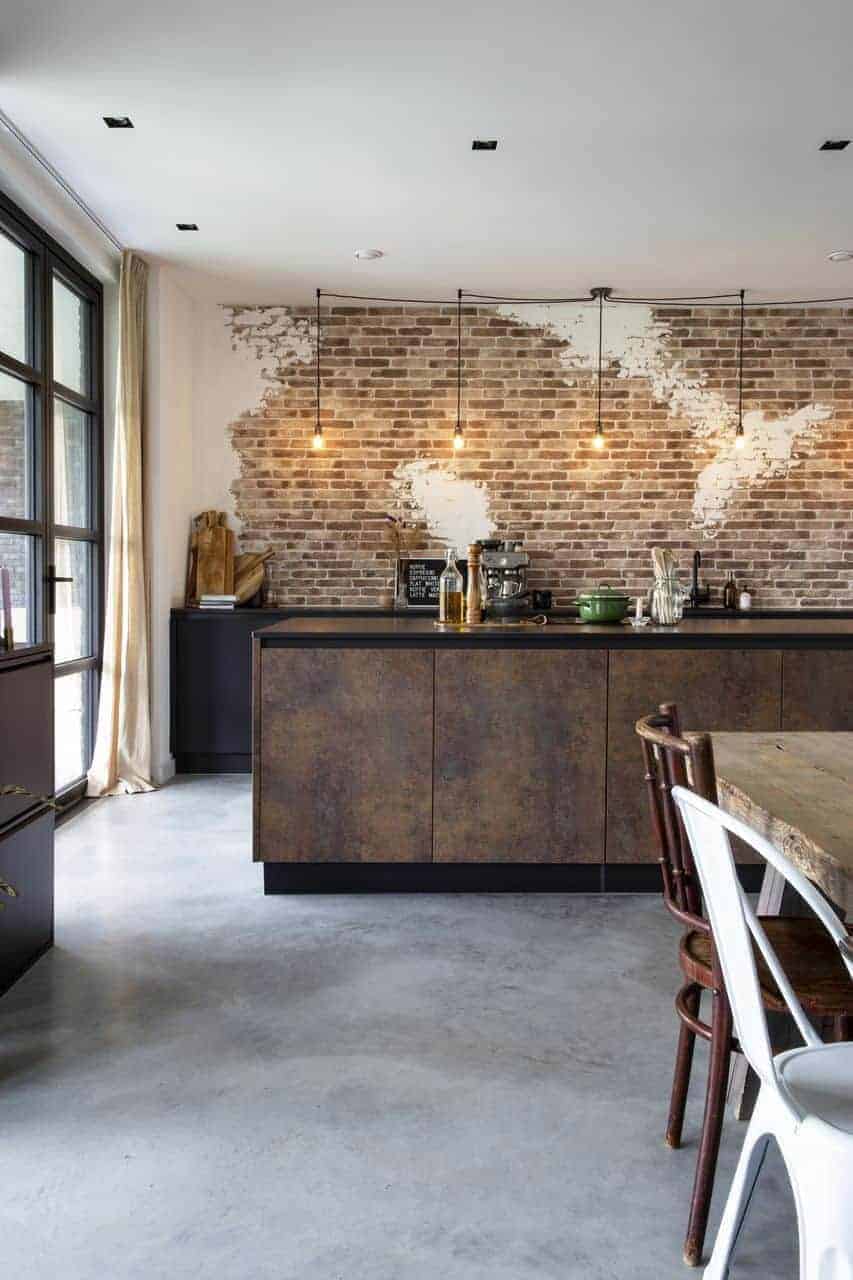 Als je deze keuken ziet denk je misschien snel aan een grote renovatie van een oud karakteristiek pand. Maar niets is minder waar. Deze keuken staat namelijk in een nieuwbouwwoning! Maar de stenen muur en de oude, hoge geloogde deuren zorgen voor een robuuste, industriële sfeer. De kleur van deze betonvloer is ook basisgrijs, maar lijkt donkerder door de donkere keuken en de lichtinval.