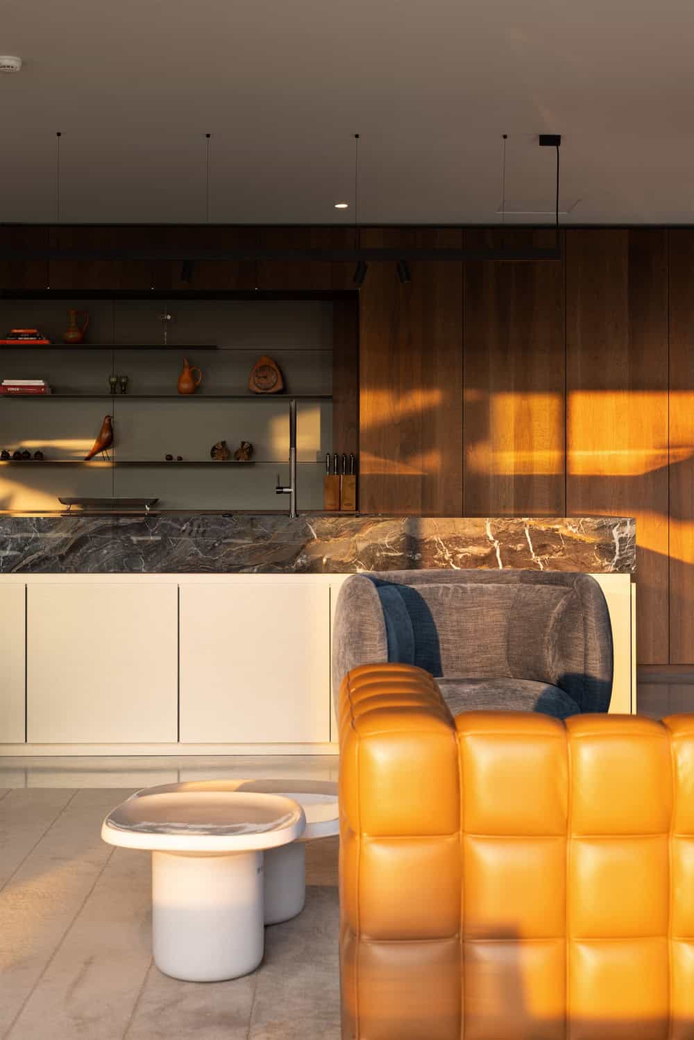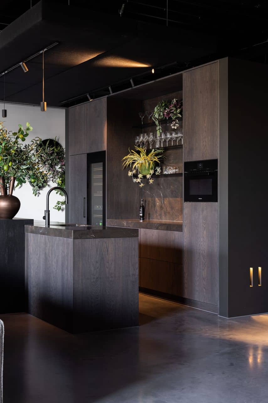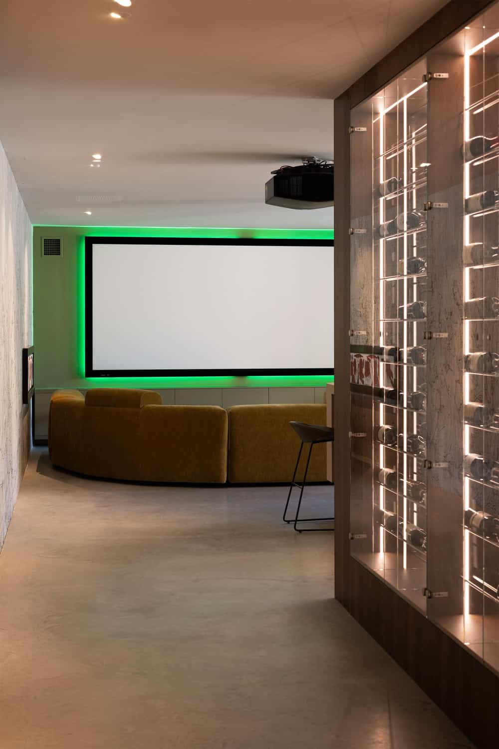 Een relaxwalhalla. Dat is wat deze mancave uit moest stralen. Wanneer je de ruimte binnenkomt zie je een bar, een heerlijke loungehoek en een jacuzzi midden in de woonkamer. Achter de bar bevindt zich de biljartruimte en als je doorloopt kom je in het wellnessgedeelte met een sauna. Op het dakterras bevindt zich de tweede jacuzzi en aan de andere kant, in de slaapkamer, vind je de derde. Er moesten harde materialen als basis worden gebruikt. Daarom is er een gevlinderde betonvloer toegepast in de hele ruimte.