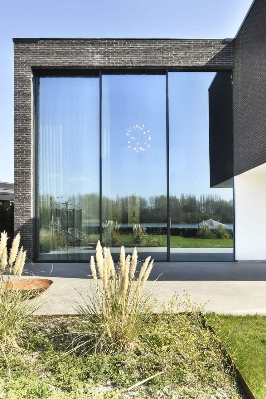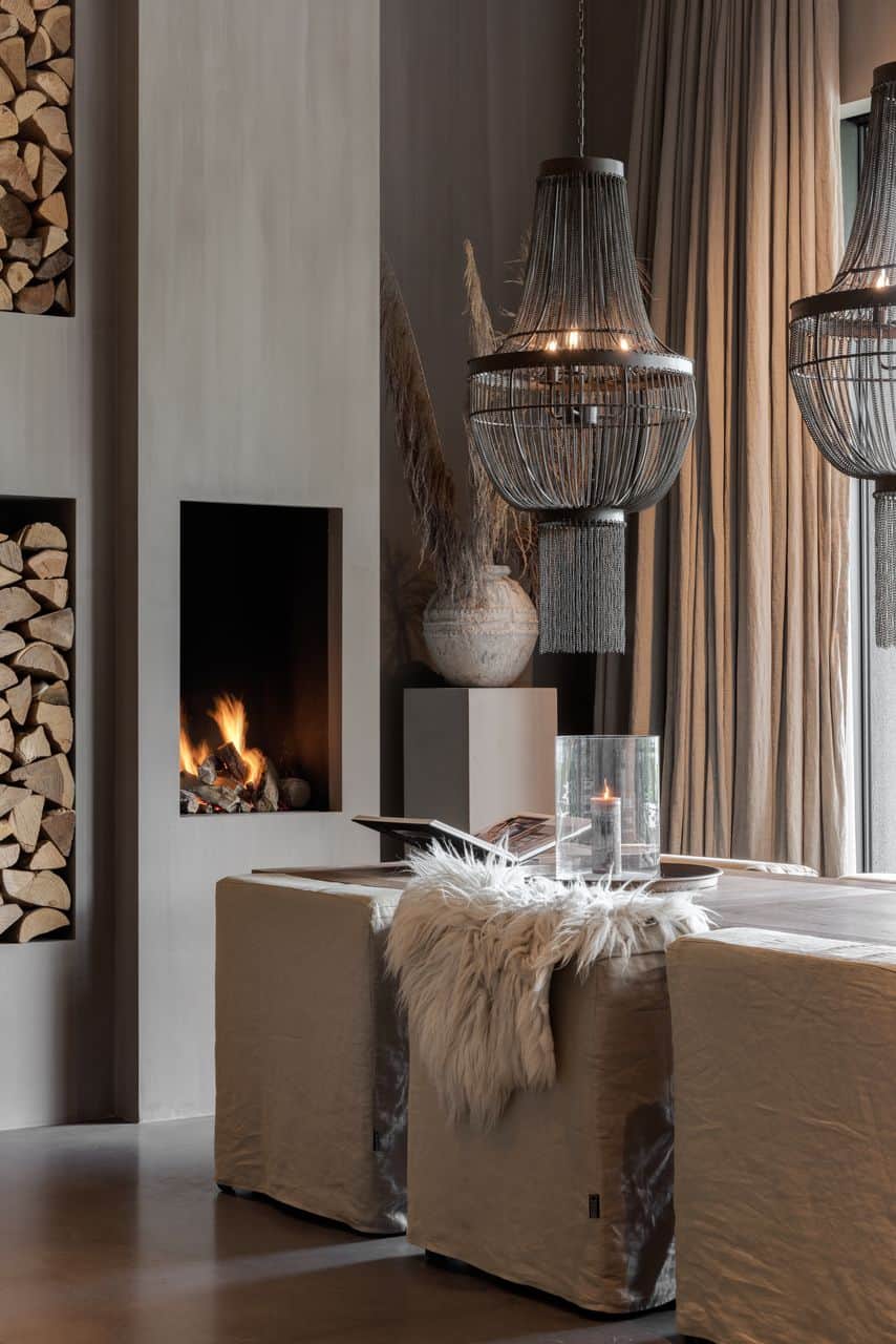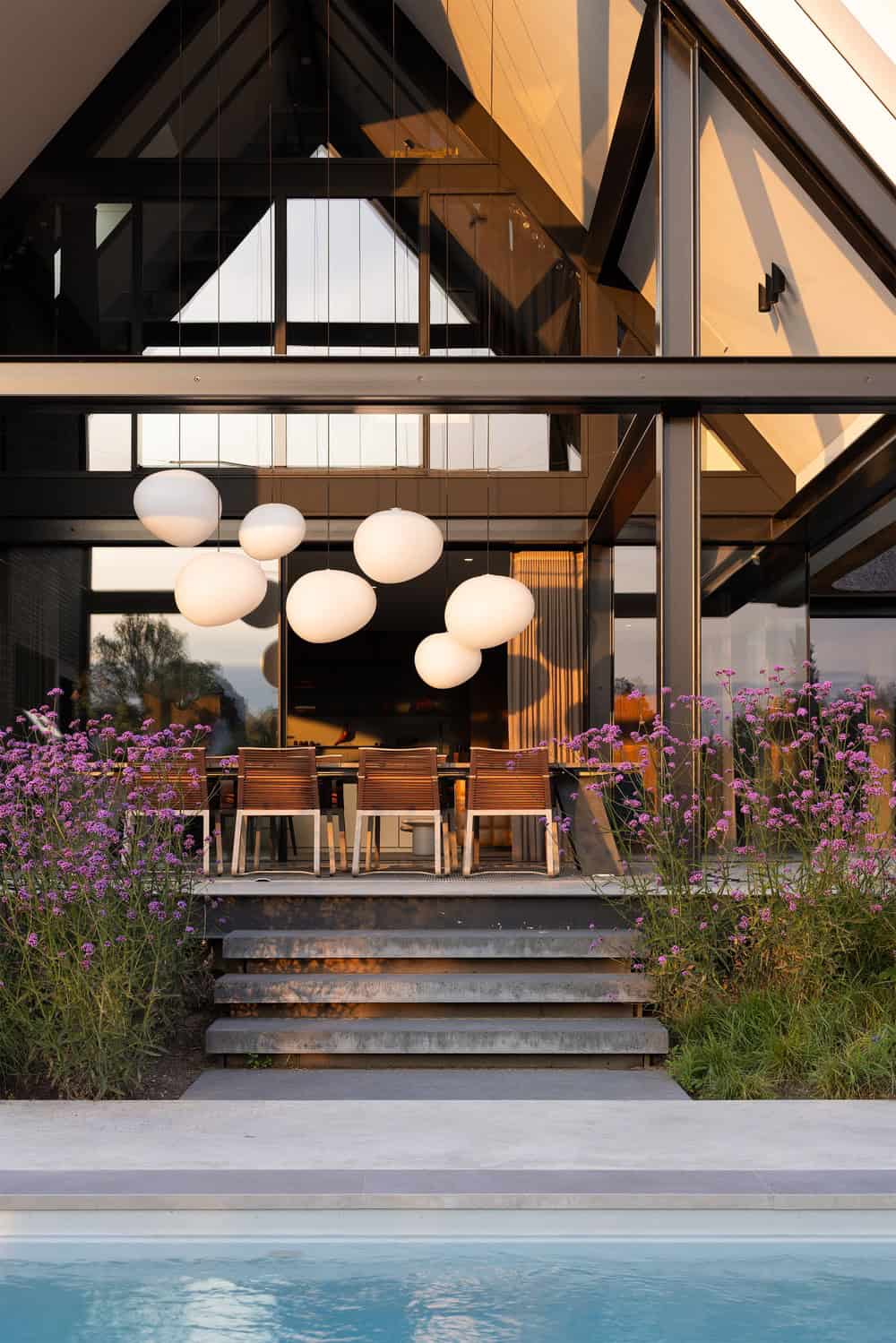 Bij binnenkomst in deze villa vallen de harde materialen meteen op. Er ligt gevlinderd beton over de hele vloer, je ziet meters glas en ruim 86 ton aan staal. Ondanks deze materialen oogt de woning sfeervol en zie je veel warme kleuren terug in het interieur. Ook buiten en rondom het zwembad zijn onze gevlinderde betonnen terrassen toegepast!