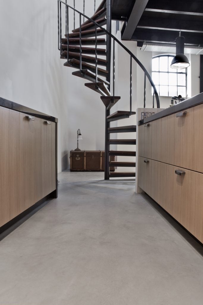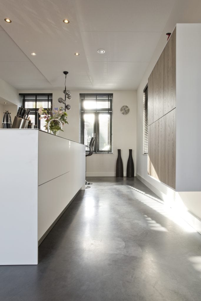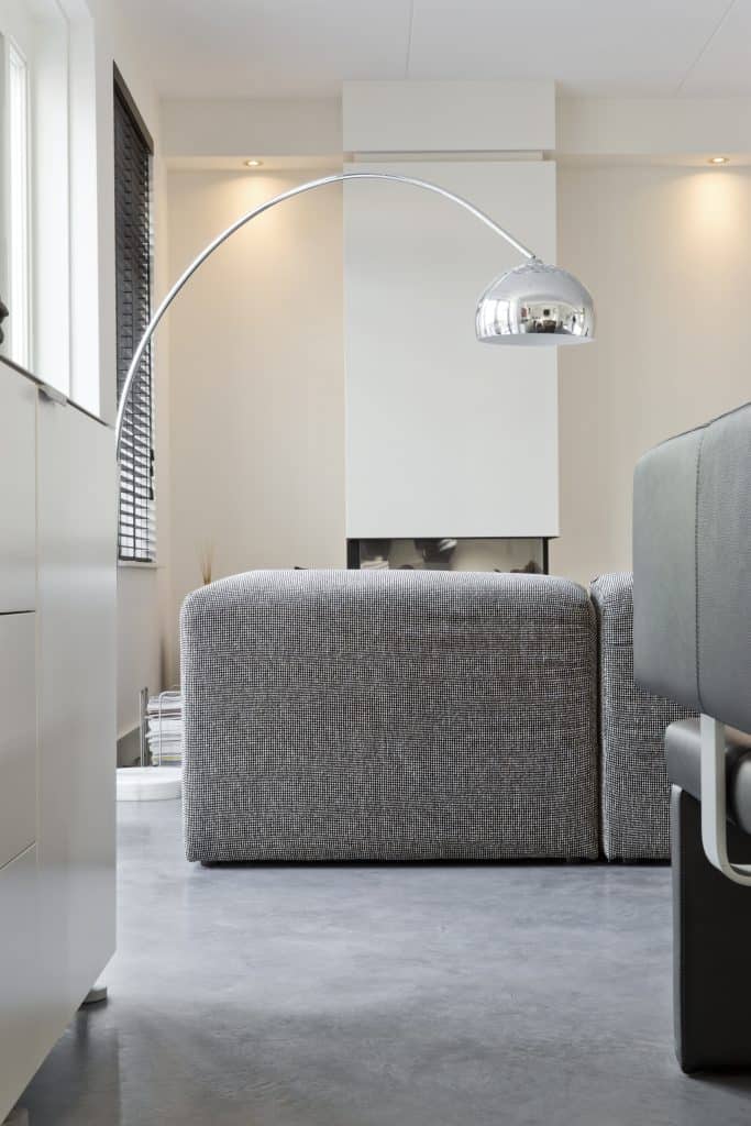 In dit project in Tiel hebben wij geen betonvloer, maar de Italiaanse betonlook vloer in de kleur Salerno gerealiseerd. De Italiaanse betonlook vloer lijkt sprekend op een betonvloer, maar is maar ca. 4 millimeter dik. Deze vloer wordt afgewerkt met vlindermachines. Hierdoor ontstaat er steeds weer een uniek eindresultaat!