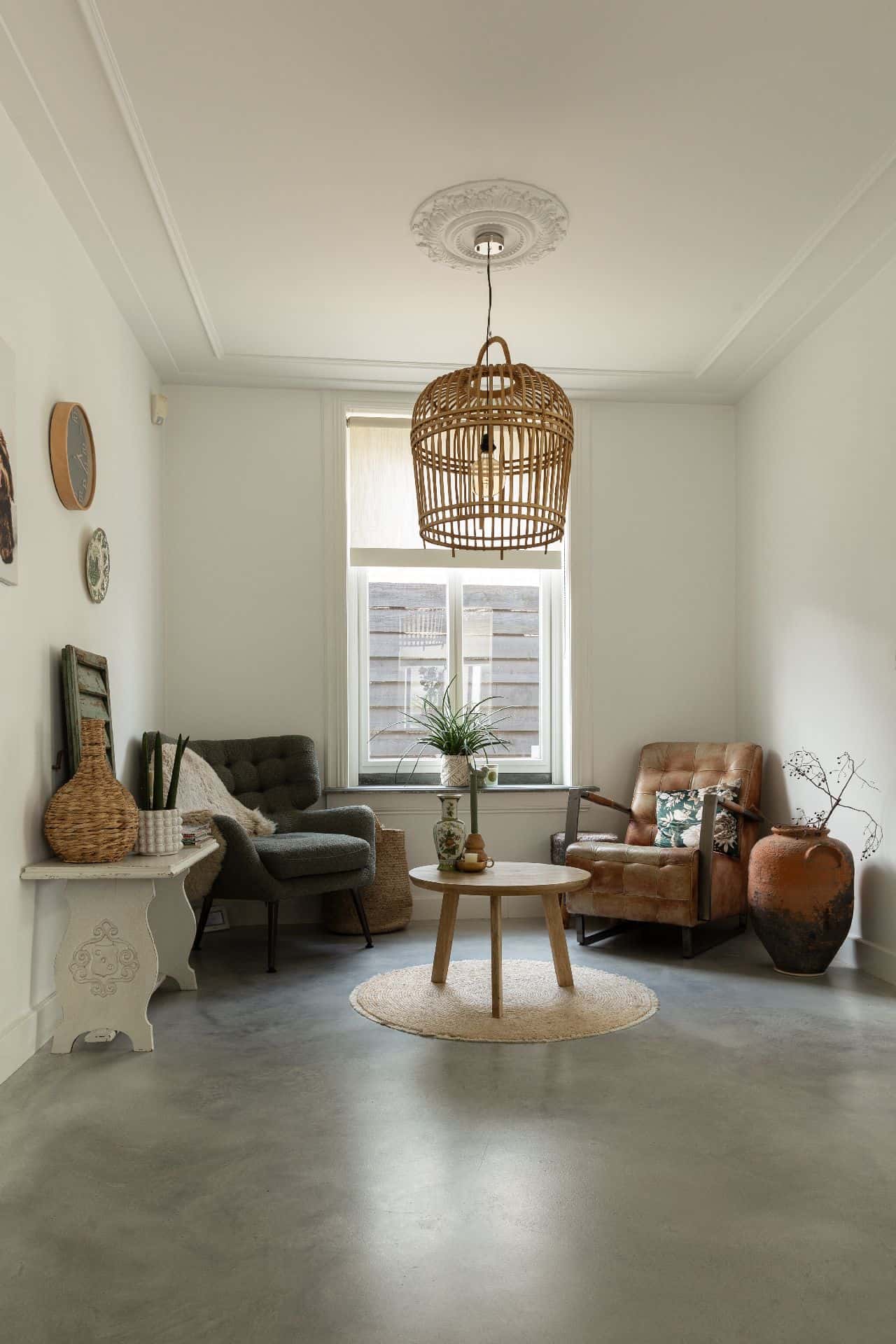 In deze woonkamer is gekozen voor een PU gietvloer in een warme zandkleur tint. Door het gebruik van natuurlijke en houten materialen komt deze vloer goed tot zijn recht. Door de stoel als eyecatcher te gebruiken is er verder weinig nodig om deze woonkamer een sfeervol interieur te geven. Door het gebruik van stalen deuren en strakke vormen is het een mix van meerdere interieurstijlen. De PU gietvloer is doorgetrokken in de badkamer en zorgt zo voor een geheel! Het is een nieuwbouwwoning in 30’er jaren stijl van de vorige eeuw.