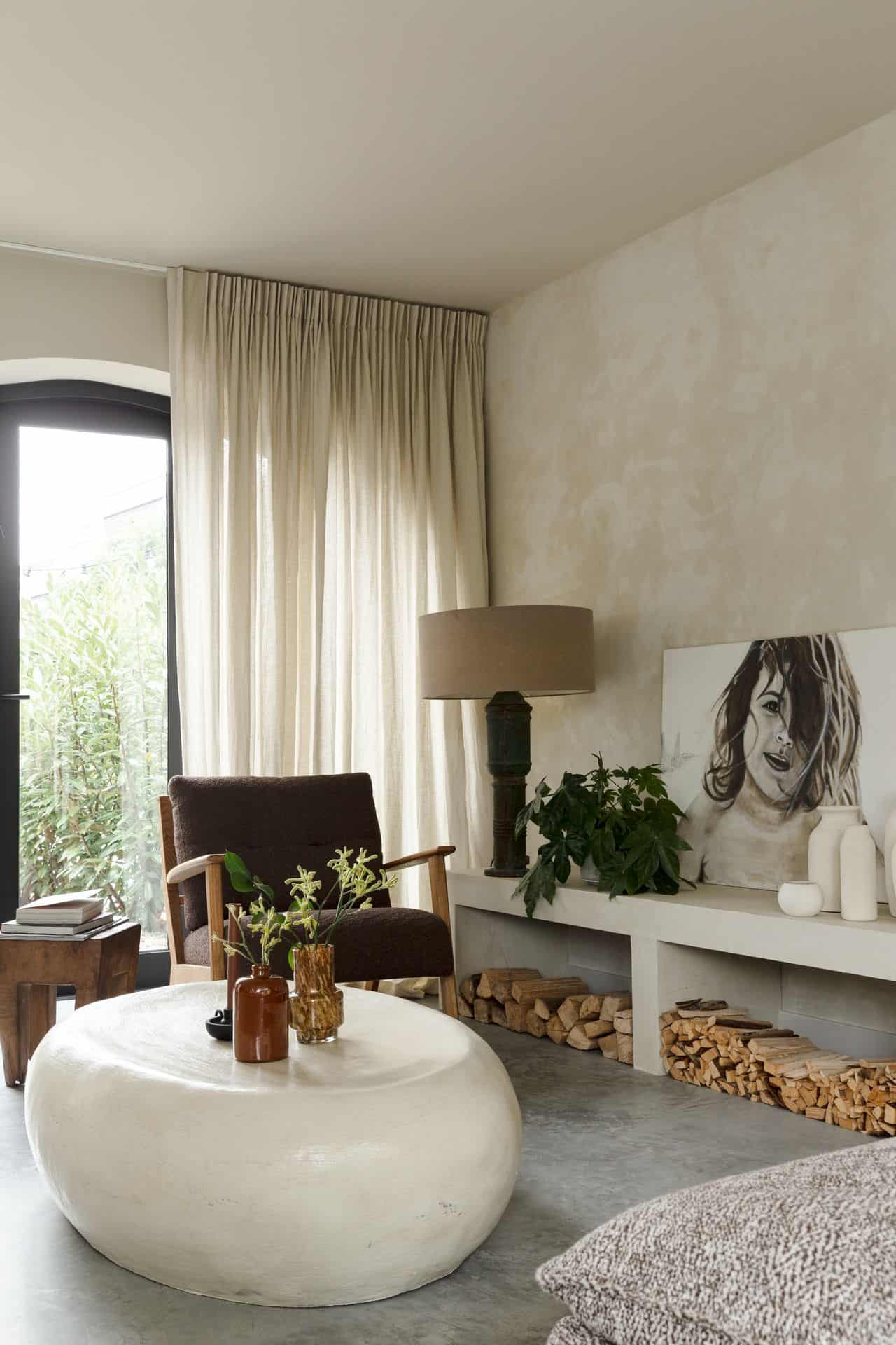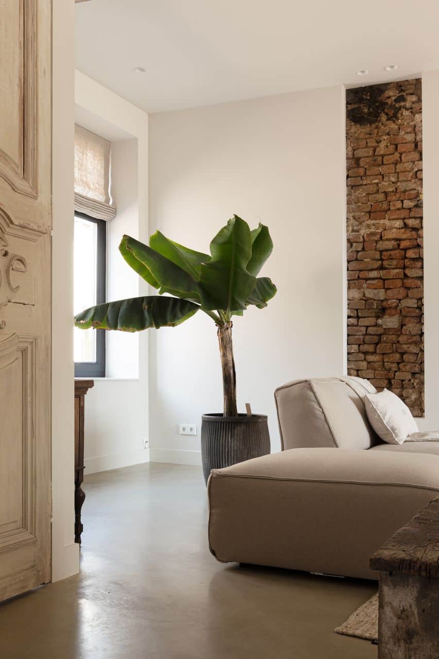 In dit project is een prachtige balans zichtbaar. De lichte, zandkleurige bank in de woonkamer komt prachtig tot zijn recht op de gevlinderde betonvloer. De bakstenen nis in de muur en de grote plant zorgen voor een natuurlijke uitstraling.