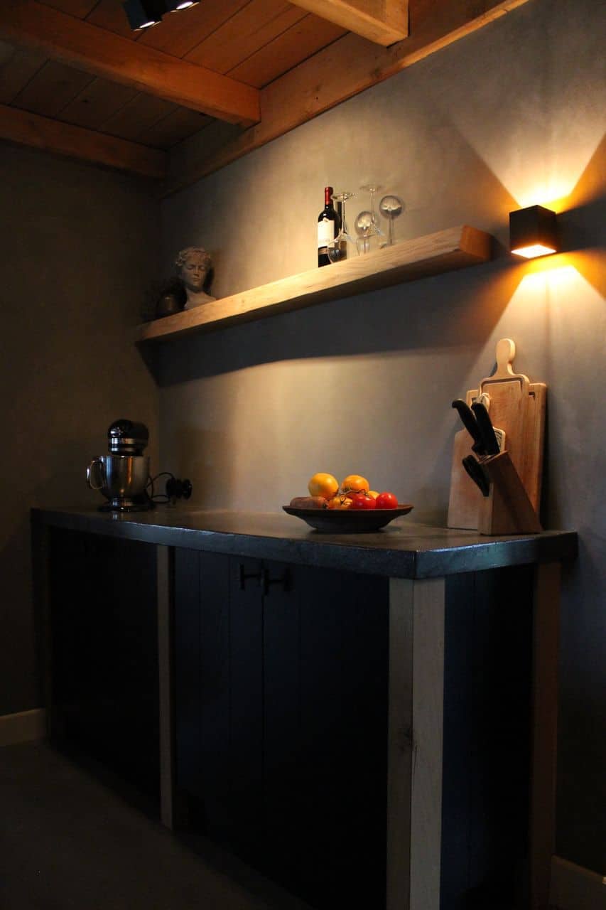 Beton ciré is een product wat 100% waterdicht is. Hierdoor is het zeer geschikt voor op de wanden in jouw keuken, want vuil kun je er zo afvegen met een doekje.
