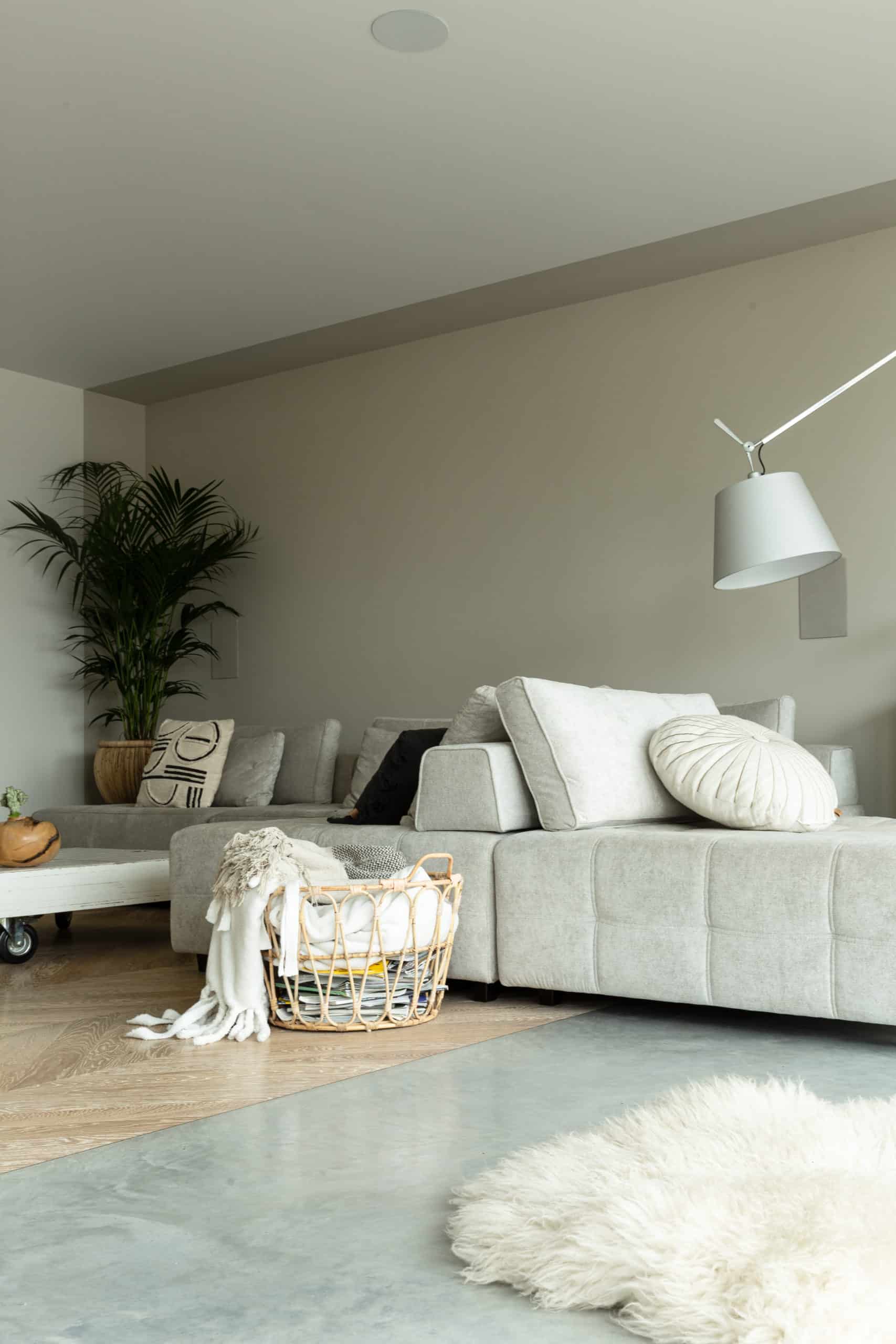 “Een betonvloer is heel praktisch, maar het is een hard materiaal. Dus er komen ook nog wat meer zachte stoffen in huis!”