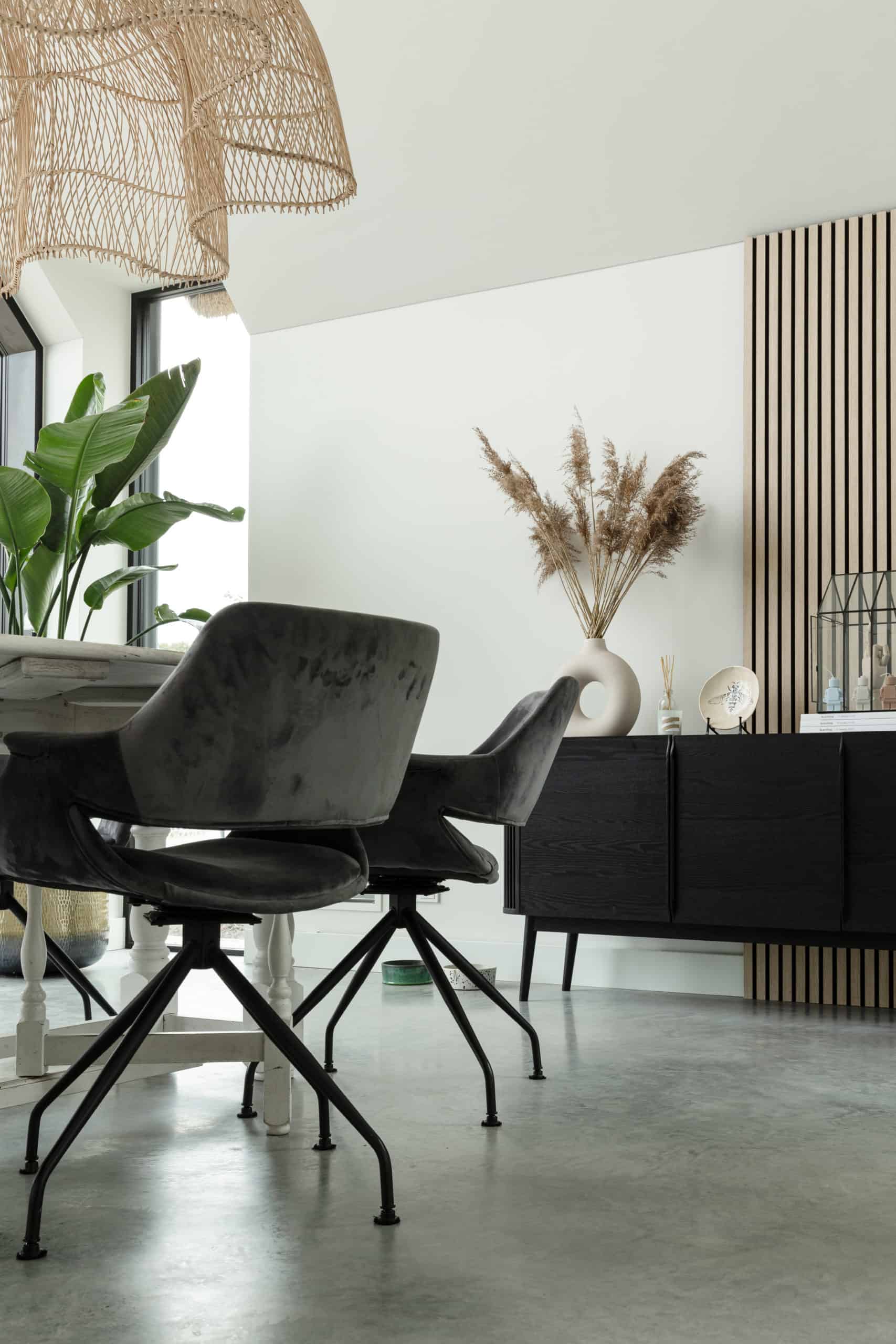 Japandi. Dat is hoe Sanne de stijl in hun nieuwgebouwde huis omschrijft. Samen met haar partner Jasper, hun twee zonen van 14 en 12 jaar oud en een hondje wonen ze met veel plezier in het Brabantse Nuenen. Ze combineerden een betonvloer in basisgrijs met een houten visgraat vloer en ook buiten kozen ze voor beton.